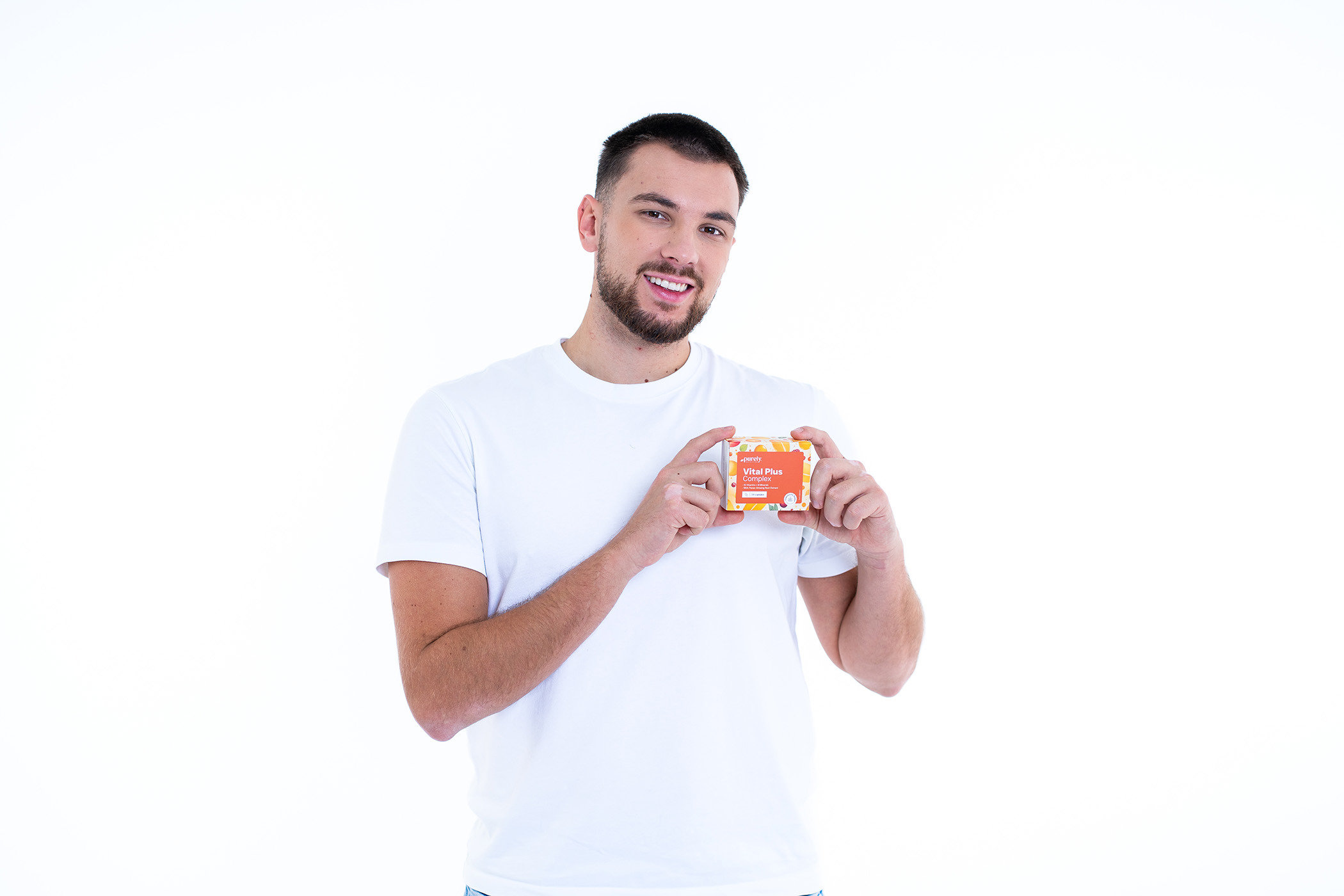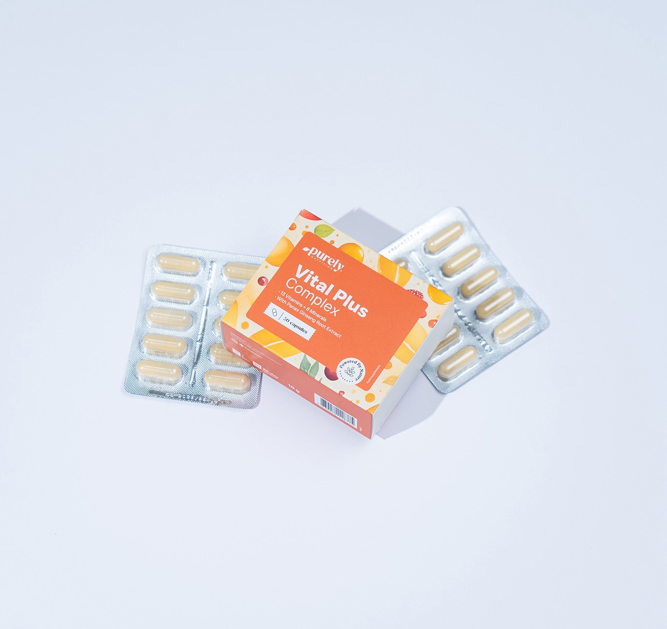 Složení: kyselina L-askorbová (vitamín C), výtažek z kořene ženšenu (Panax ginseng), nikotinamid (vitamín B3), síran železnatý, D-alfa-tokoferol acetát (vitamín E), síran zinečnatý, D-pantothenát vápenatý (vitamín B5), síran manganatý, riboflavin (vitamín B2), pyridoxin hydrochlorid (vitamín B6), thiamin mononitrát (vitamín B1), síran měďnatý, retinylacetát (vitamín A), kyselina pteroylmonoglutamová (vitamín B9/kyselina listová), jodid draselný, menachinon (vitamín K2), seleničitan sodný, cholekalciferol (vitamín D3), D-biotin (vitamín B7), molybdenan sodný, chlorid chromitý (III), kyanokobalamin (vitamín B12), želatina (kapsle), maltodextrin, protispékavá látka: hořečnaté soli mastných kyselin, barvivo: uhličitan vápenatý.